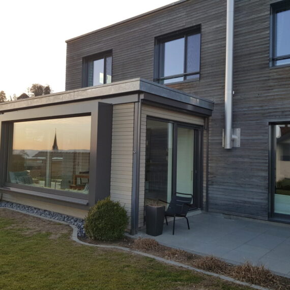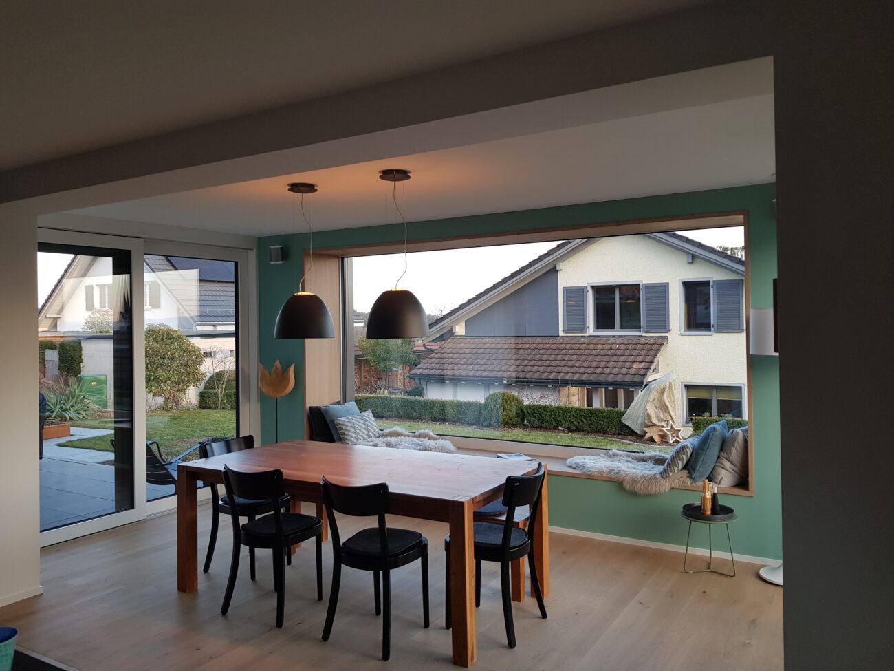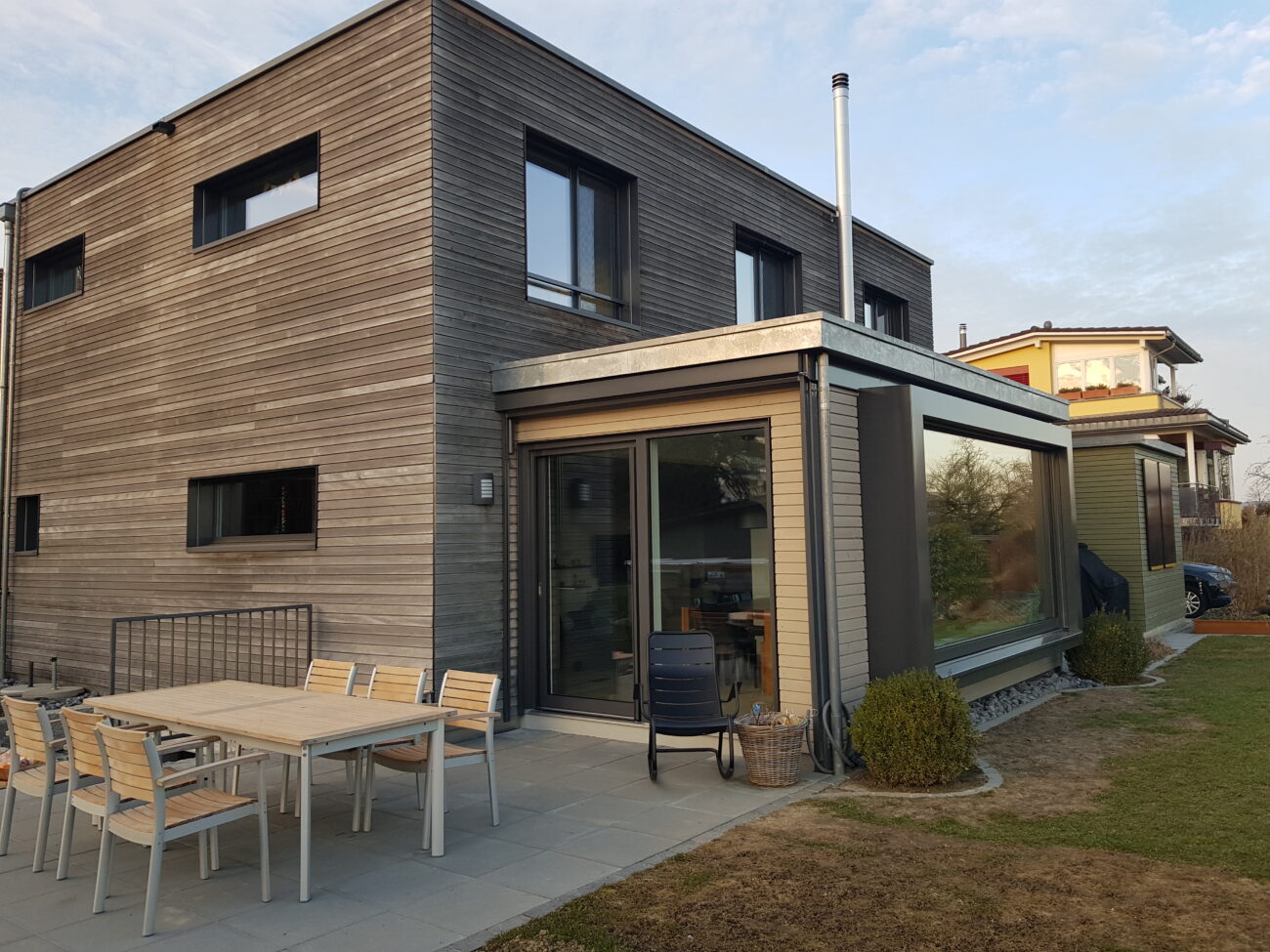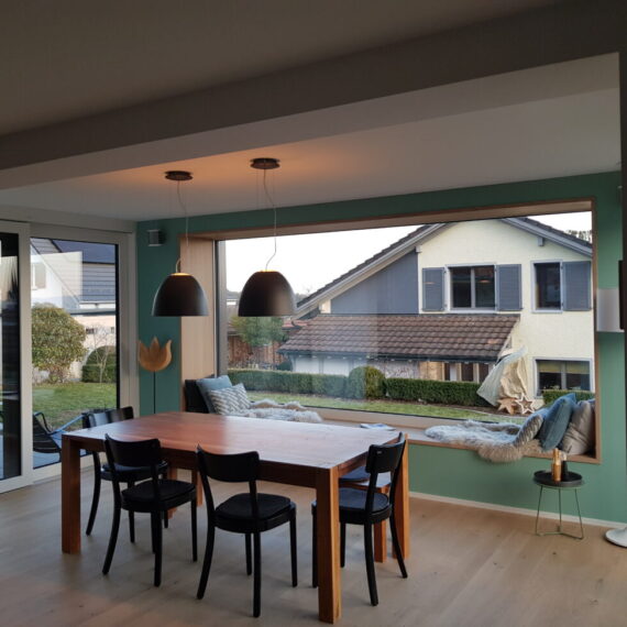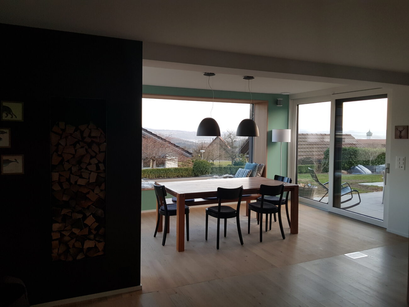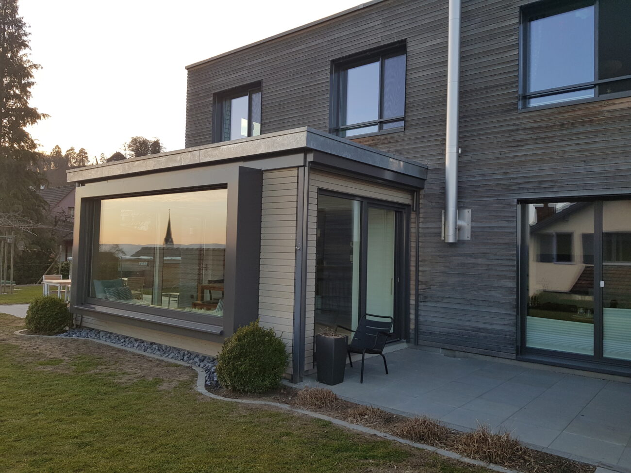 Die bestehende Pergola wurde zu zusätzlicher Wohnfläche ausgebaut. Der Anbau ist an die bestehende Fassade angepasst und fügt sich somit in die Umgebung ein. Im Innenraum wurde der Cheminée-Bereich ergänzt. Das Grosse Sitzfenster (1.8 x 4m) mit Beschattung und die Schiebetüren geben dem Raum viel Licht.