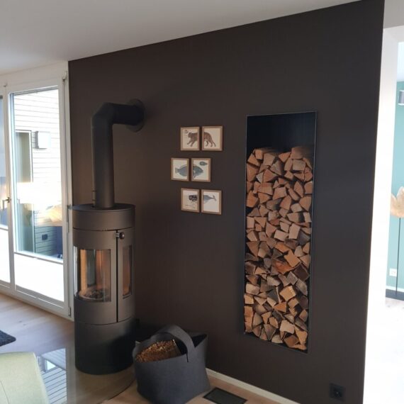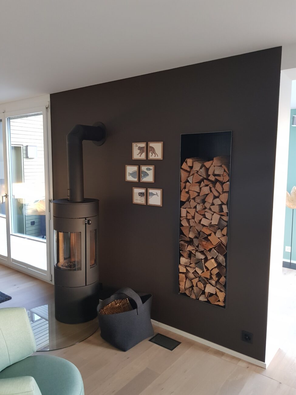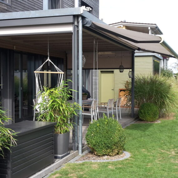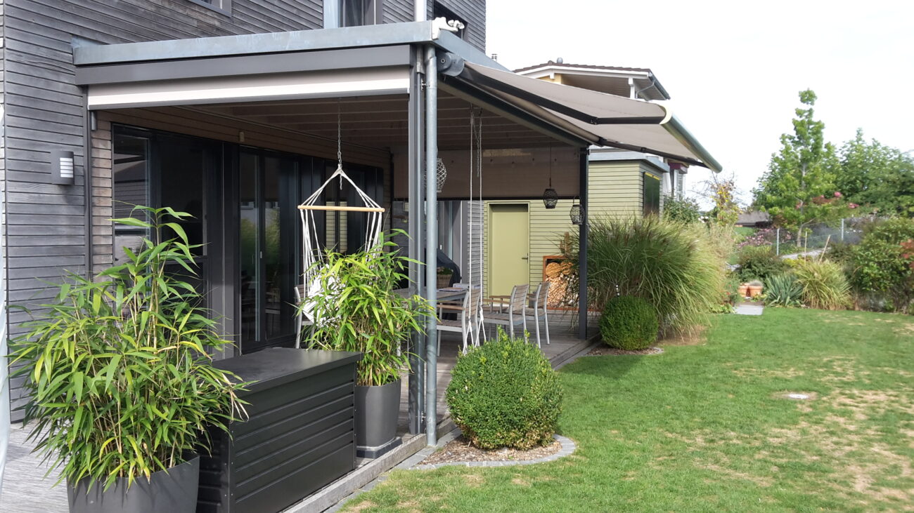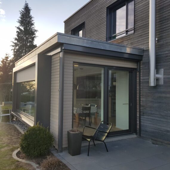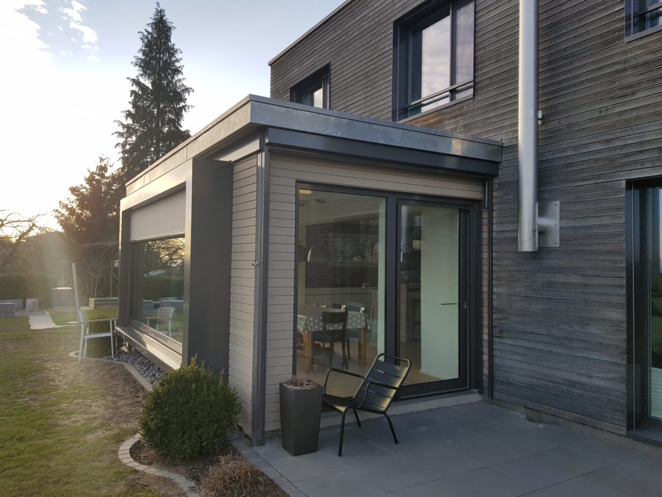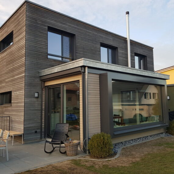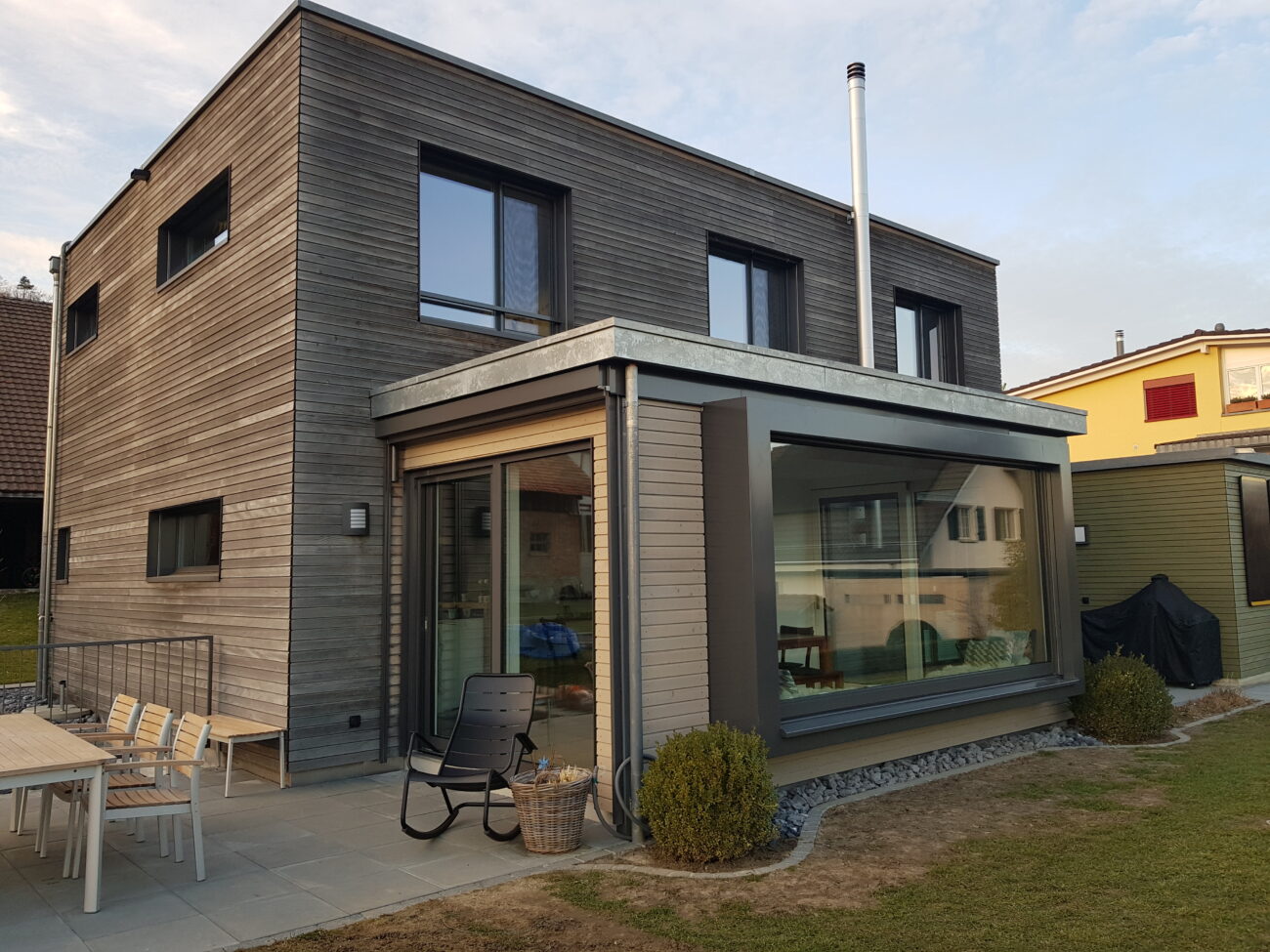 Die bestehende Pergola wurde zu zusätzlicher Wohnfläche ausgebaut. Der Anbau ist an die bestehende Fassade angepasst und fügt sich somit in die Umgebung ein. Im Innenraum wurde der Cheminée-Bereich ergänzt. Das Grosse Sitzfenster (1.8 x 4m) mit Beschattung und die Schiebetüren geben dem Raum viel Licht.