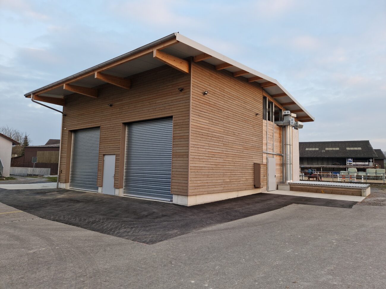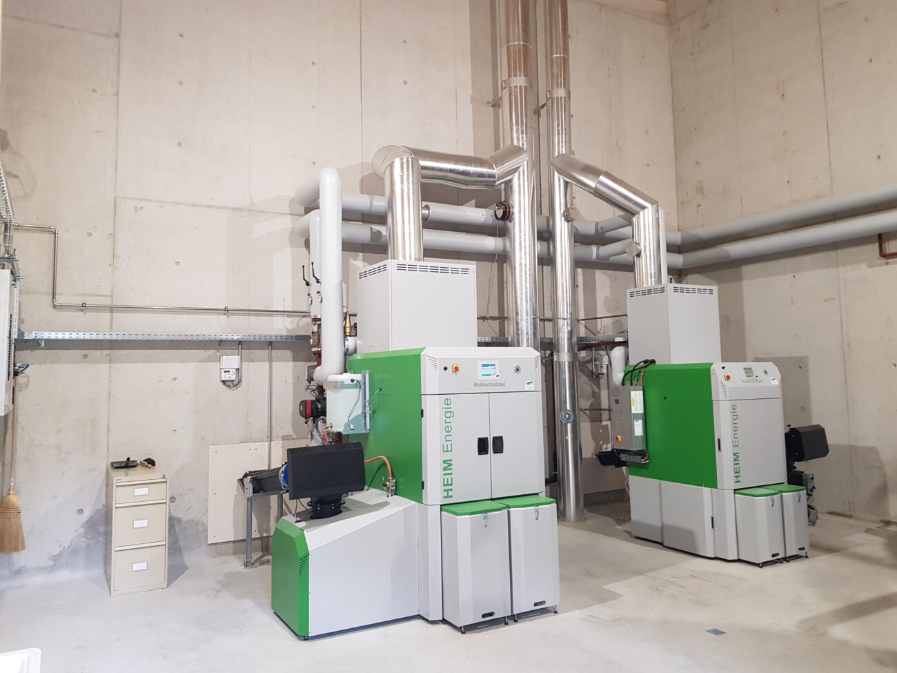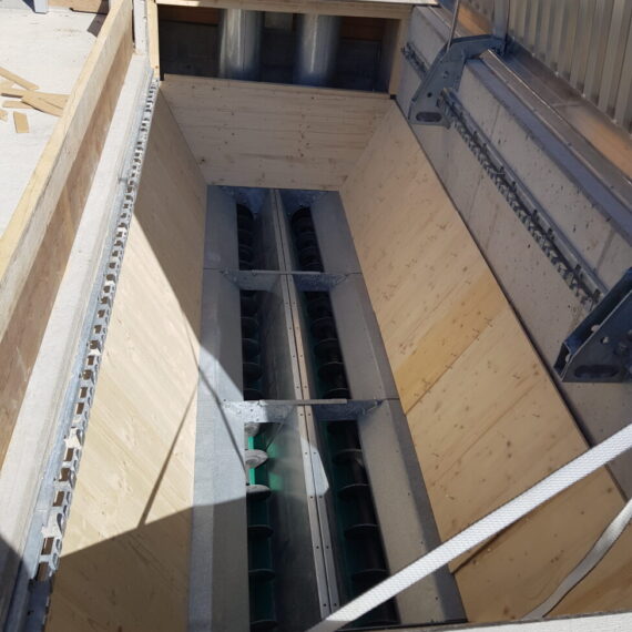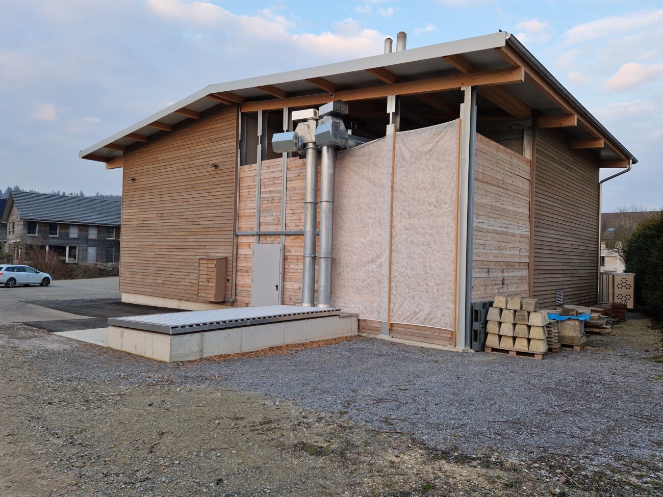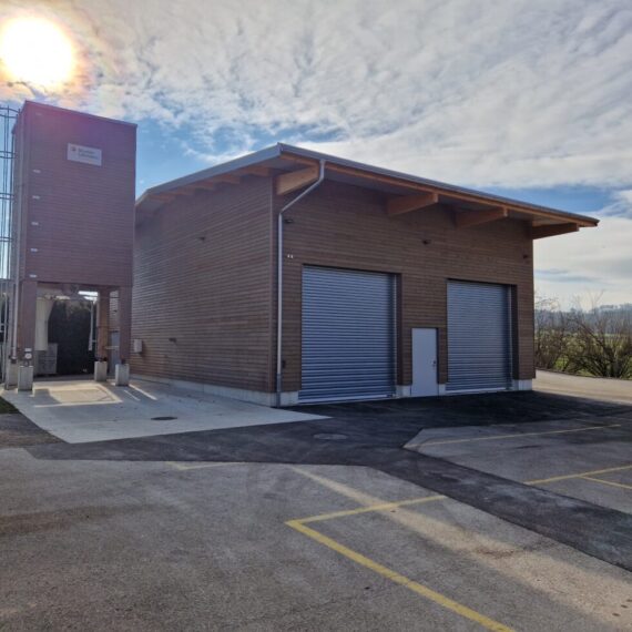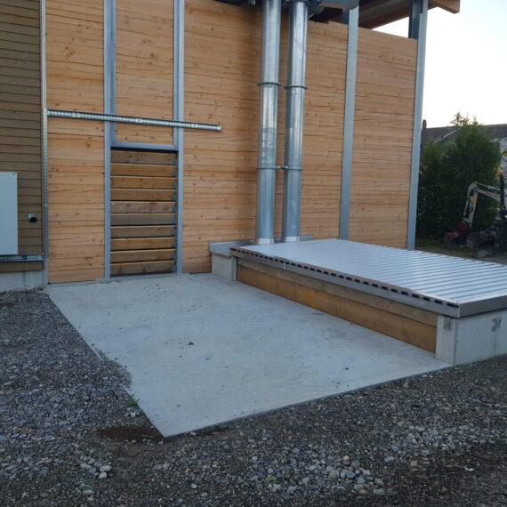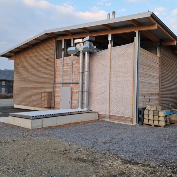 In Rickenbach war es erforderlich, die veraltete Schnitzelheizung zu ersetzen und gleichzeitig den Wärmeverbund zu erweitern. Der Neubau wurde für eine Schnitzelheizung mit einer Leistung von 260 KW sowie einen Schnitzelsilo mit einem Fassungsvermögen von etwa 100m3 konzipiert. Vor dem Schnitzelsilo befindet sich eine Abladestelle mit einer Senkrechtbefüllschnecke, die die Schnitzel in den Silo fördert. Im Norden wurde eine Einstellhalle für das Gemeindewerk errichtet, und im Osten konnten ein Salzsilo sowie ein Waschplatz realisiert werden. Darüber hinaus wurde das Fernwärmeleitungsnetz um drei neue Bezüger erweitert, und die alten Ölheizungen wurden ersetzt.