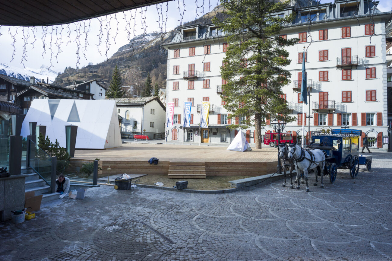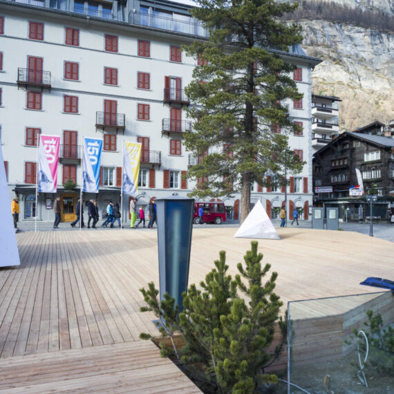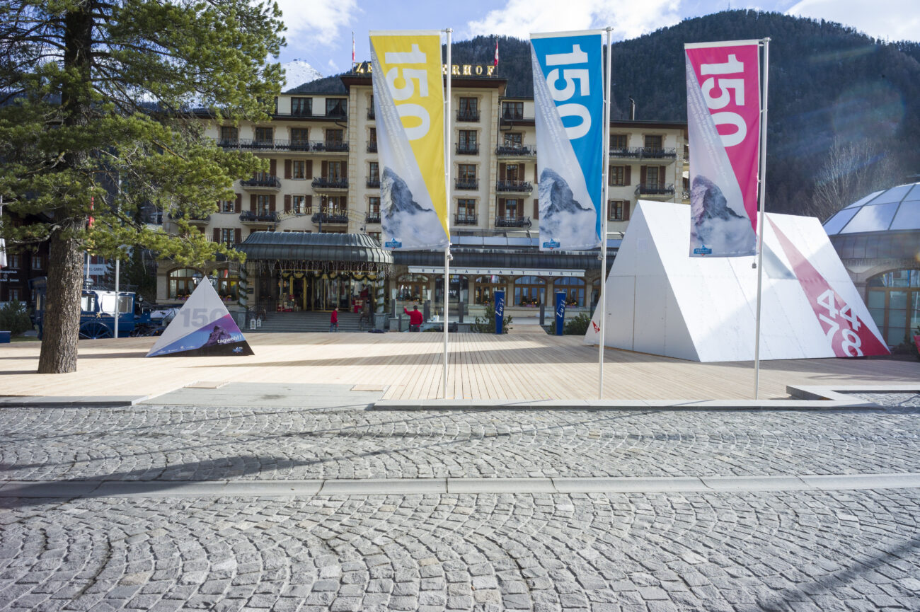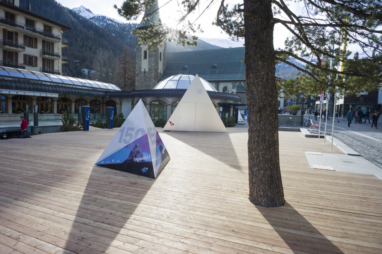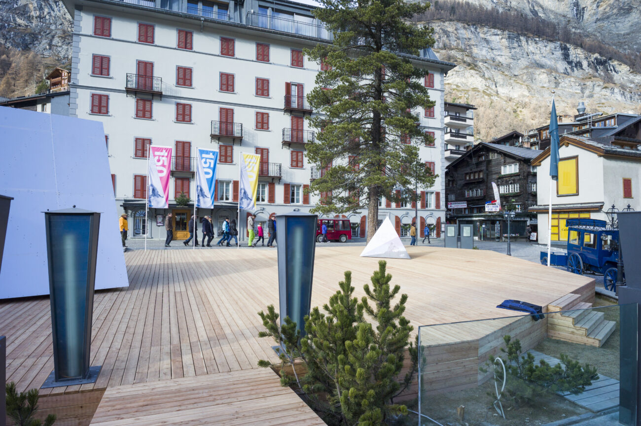 Eine 400m2 grosse, temporäre Platform aus Lärchenholz vor dem Hotel Zermatterhof, dient als Ausstellungs- und Veranstaltungsfläche der 150 Jahrfeier zur Erstbesteigung des Matterhorns. Es wurde ein Basecamp-Shelter mit einem neuen Innenausbau und Heizung und Isolation ausgestattet und wieder verwendet.