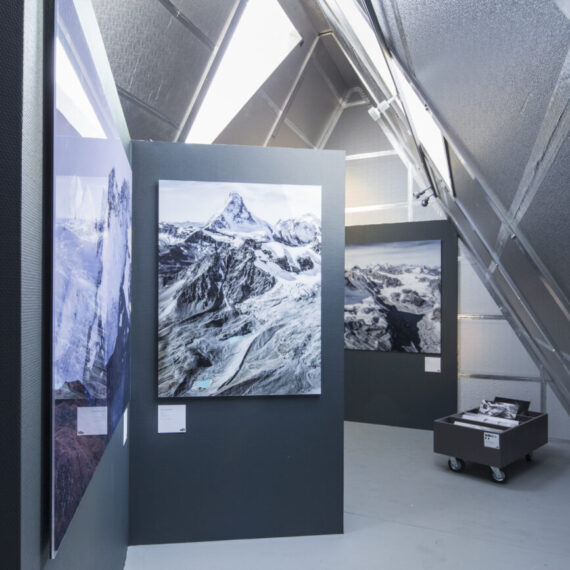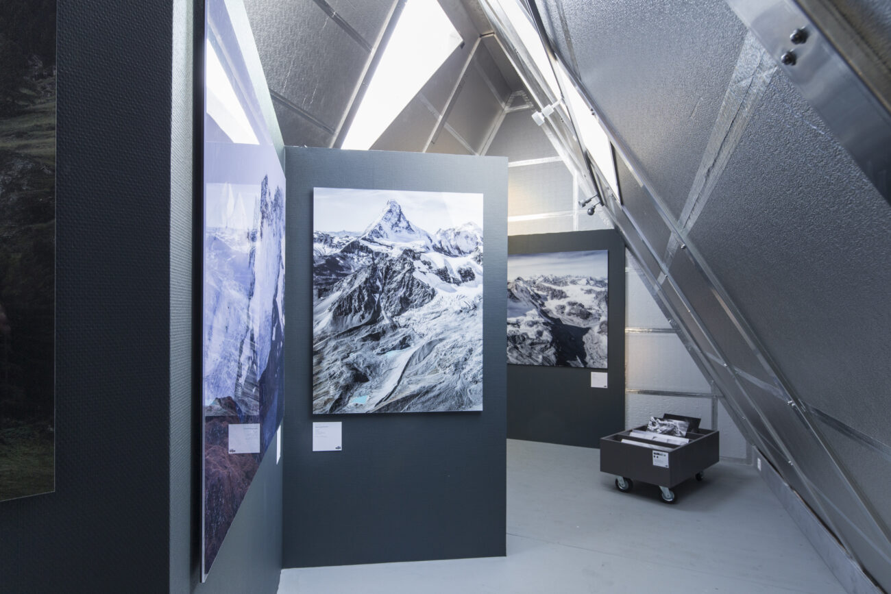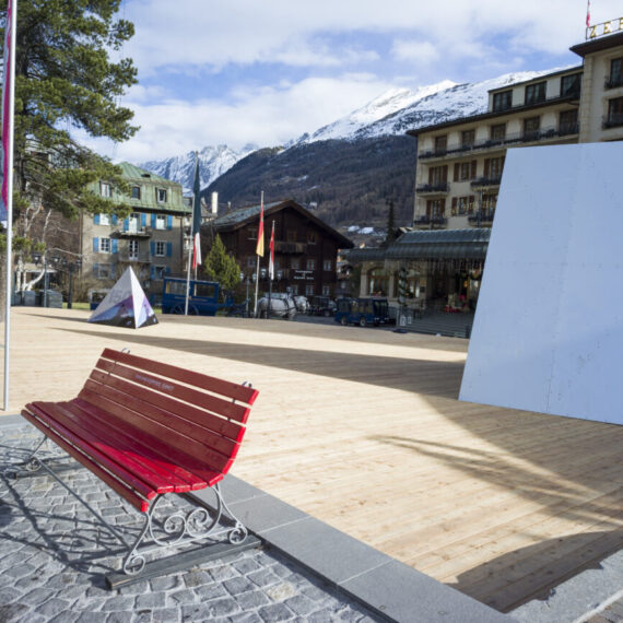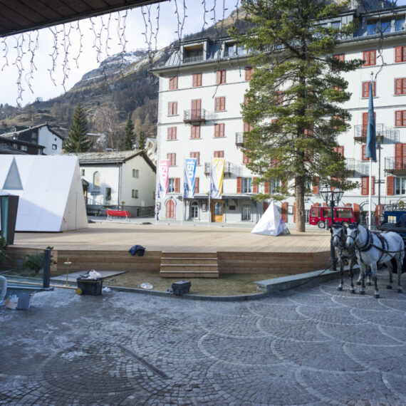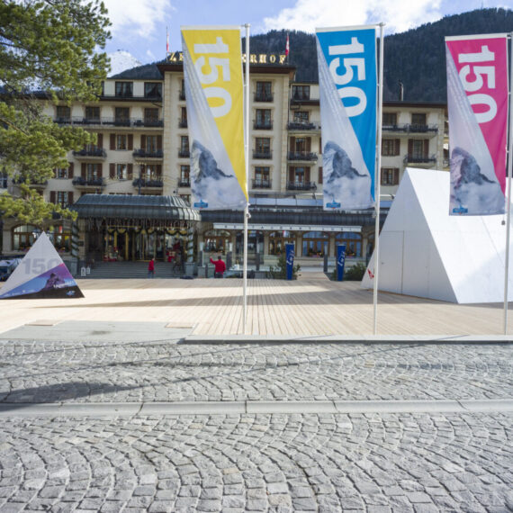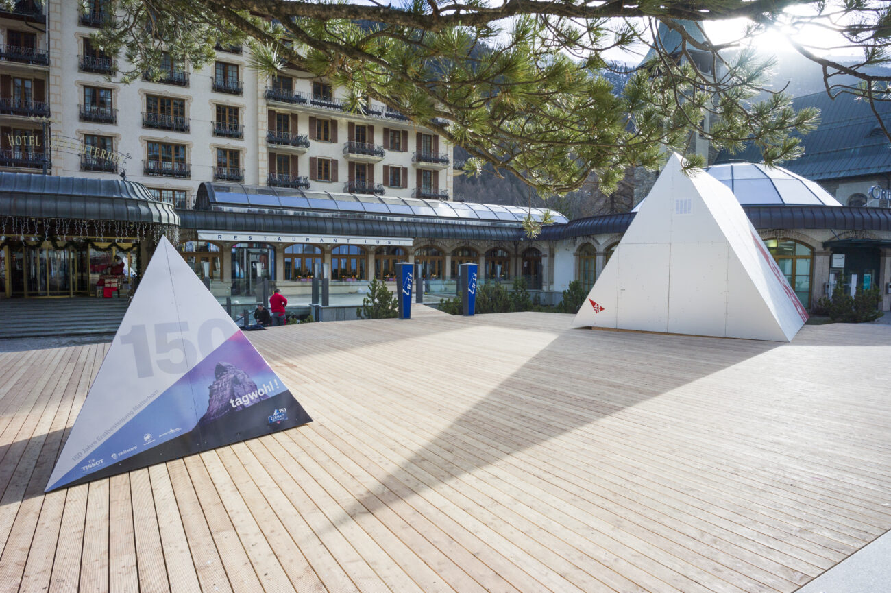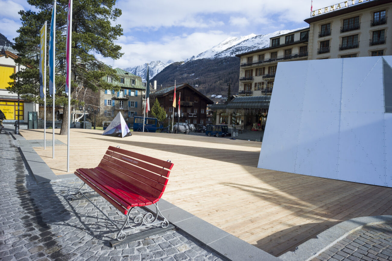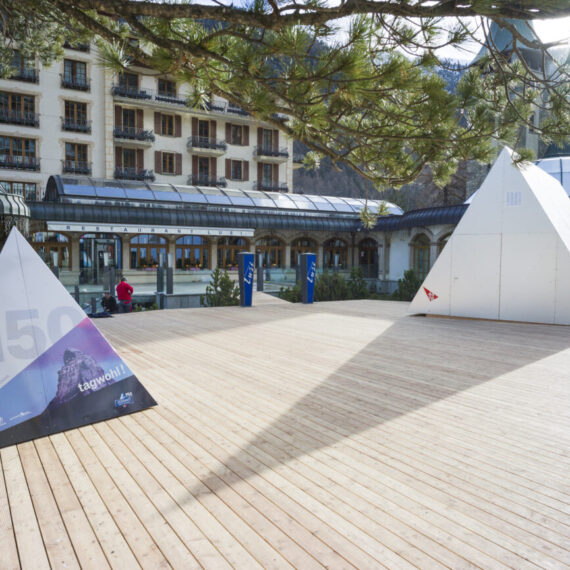 Eine 400m2 grosse, temporäre Platform aus Lärchenholz vor dem Hotel Zermatterhof, dient als Ausstellungs- und Veranstaltungsfläche der 150 Jahrfeier zur Erstbesteigung des Matterhorns. Es wurde ein Basecamp-Shelter mit einem neuen Innenausbau und Heizung und Isolation ausgestattet und wieder verwendet.