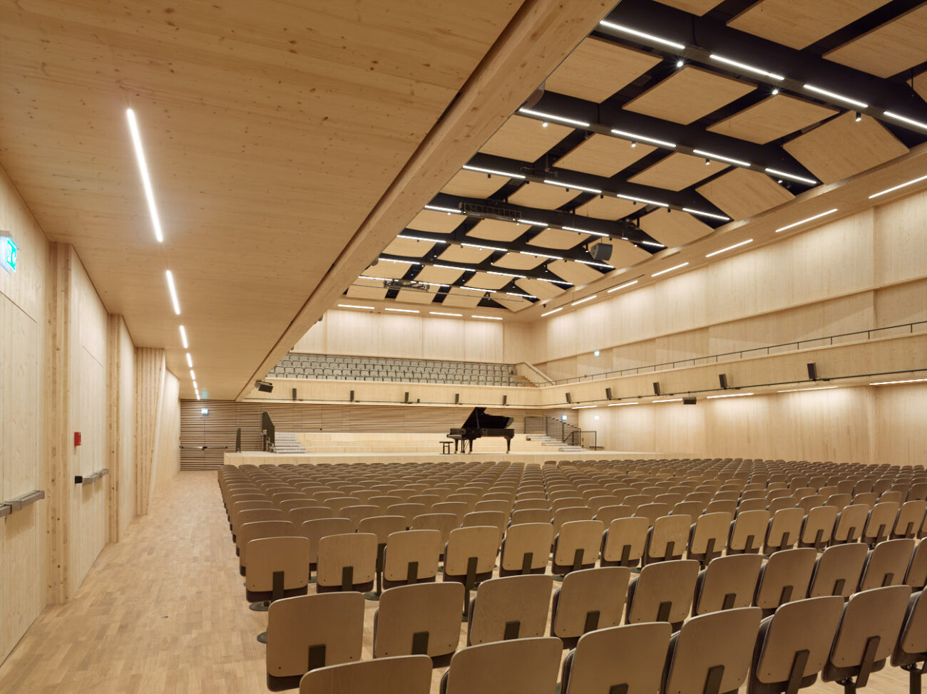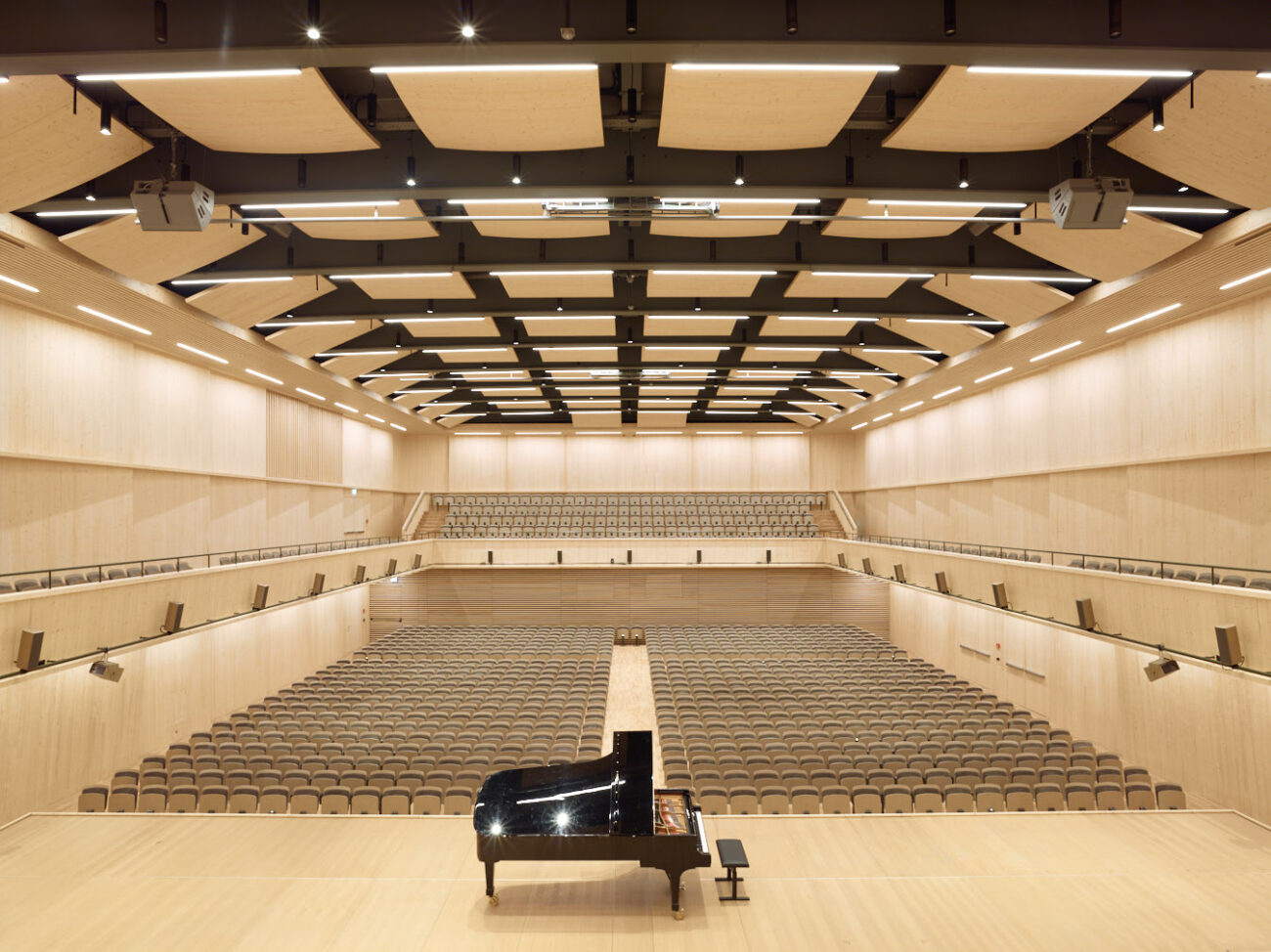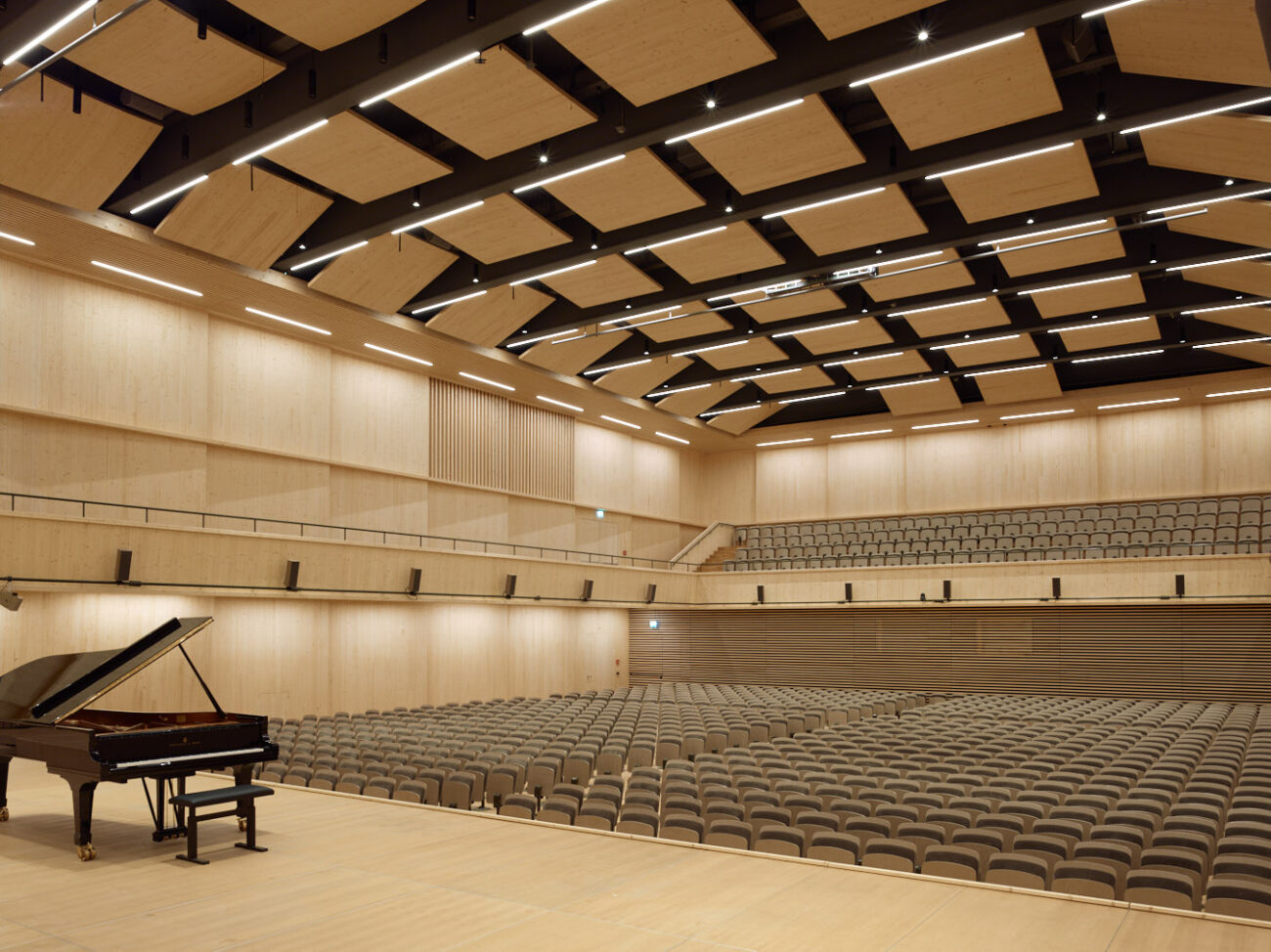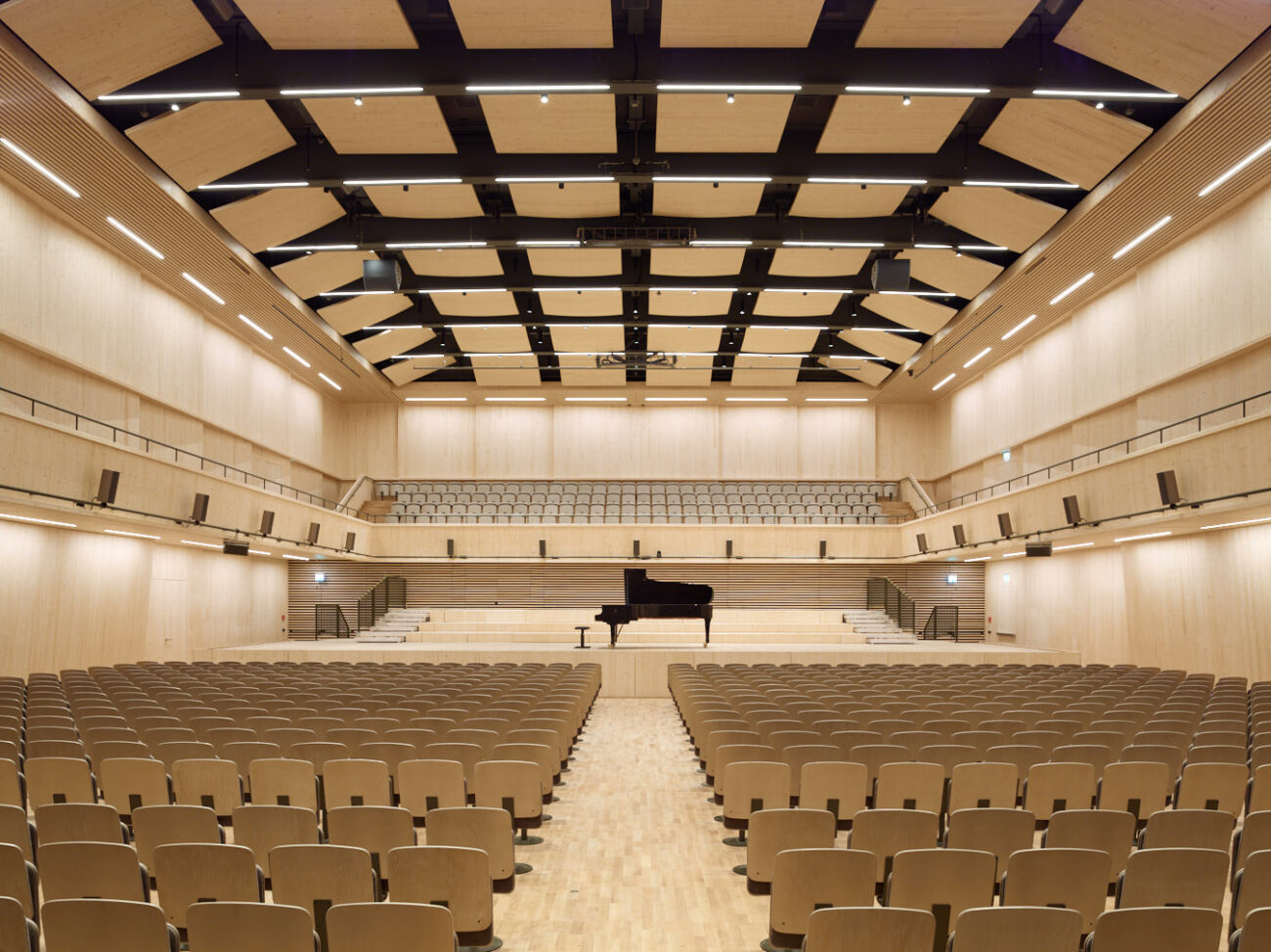 In nur 8 Monaten wurden in die bestehende industrielle Struktur der ehemaligen Zahnradfabrik Maag neben dem Konzertsaal ein Foyer mit Kassen und Garderoben sowie zahlreiche Räume für das Orchester und die Administration eingebaut. Der Konzertsaal, der als grosse „Box“ aus lasierter Fichte in die ehemalige Maag Event Hall gebaut wurde, wirkt zeitlos, ruhig und elegant. Das multifunktionale Parkett kann unterschiedlich bestuhlt werden. Den ganzen Raum umläuft eine fix bestuhlte Galerie. Insgesamt gut 1200 Menschen finden hier Platz.