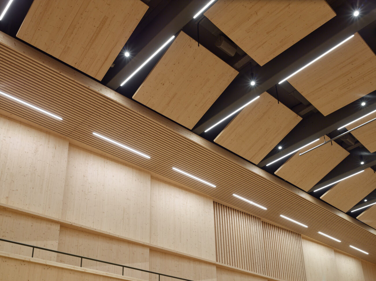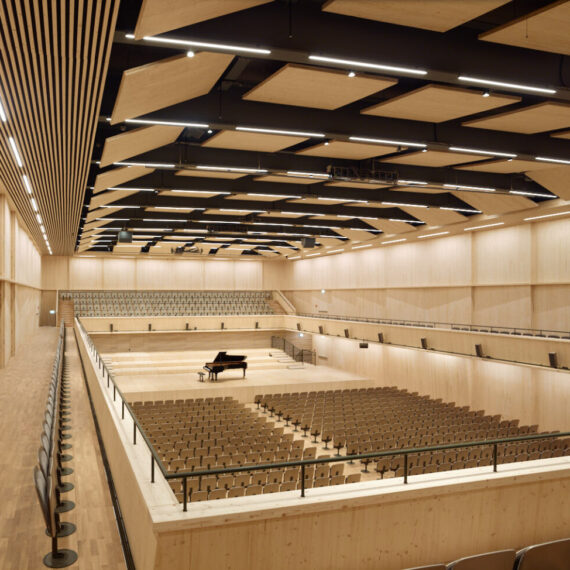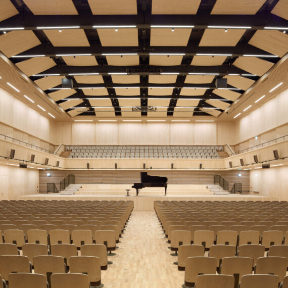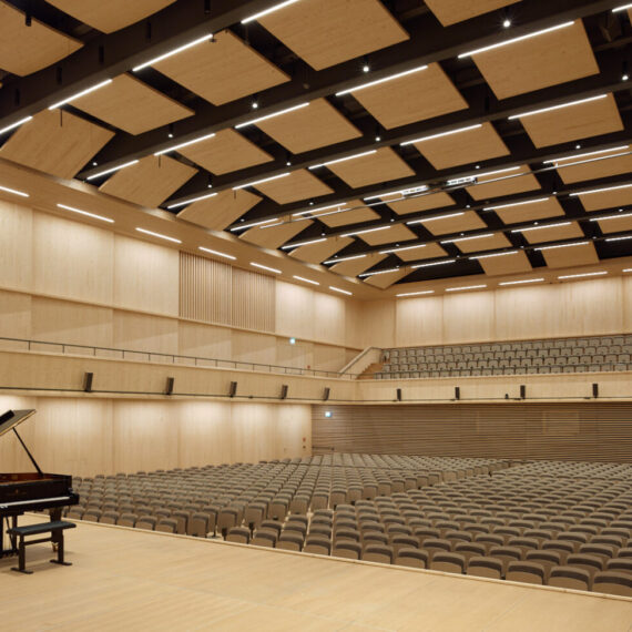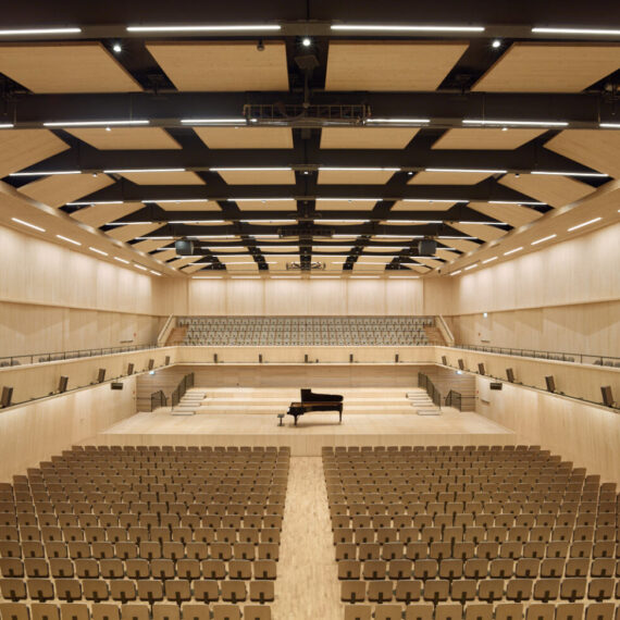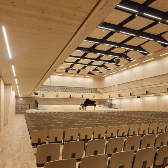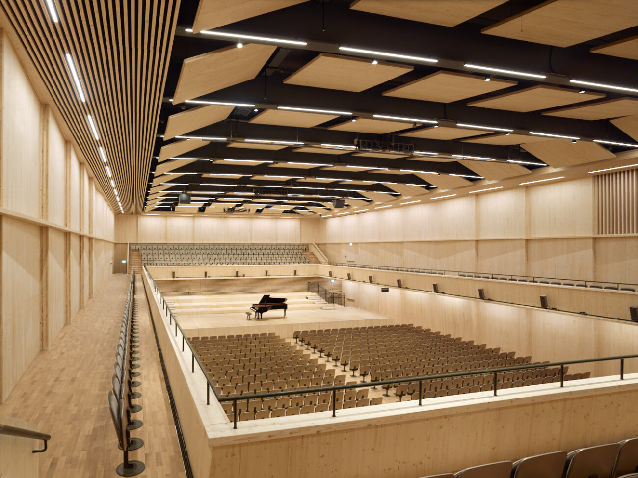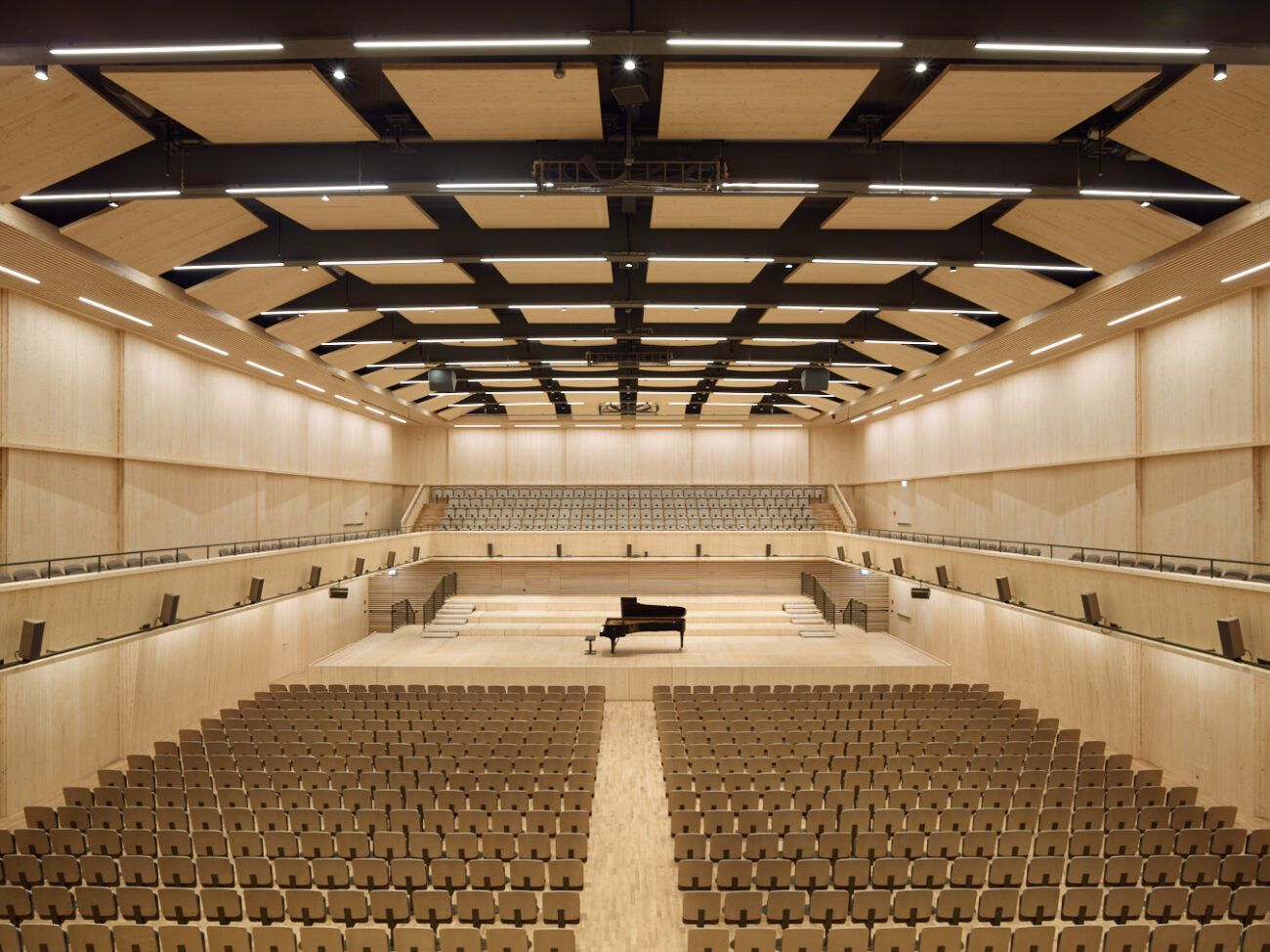 In nur 8 Monaten wurden in die bestehende industrielle Struktur der ehemaligen Zahnradfabrik Maag neben dem Konzertsaal ein Foyer mit Kassen und Garderoben sowie zahlreiche Räume für das Orchester und die Administration eingebaut. Der Konzertsaal, der als grosse „Box“ aus lasierter Fichte in die ehemalige Maag Event Hall gebaut wurde, wirkt zeitlos, ruhig und elegant. Das multifunktionale Parkett kann unterschiedlich bestuhlt werden. Den ganzen Raum umläuft eine fix bestuhlte Galerie. Insgesamt gut 1200 Menschen finden hier Platz.