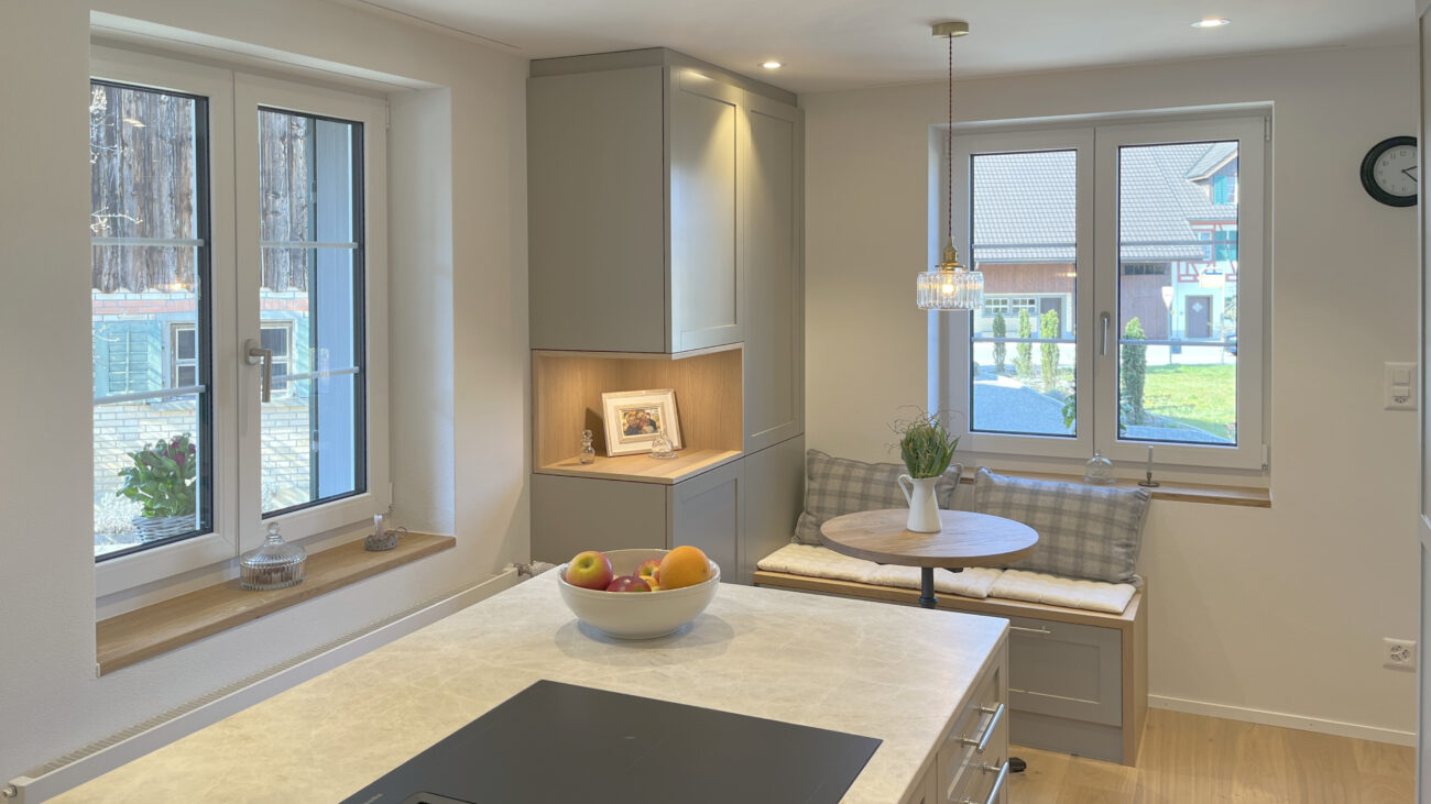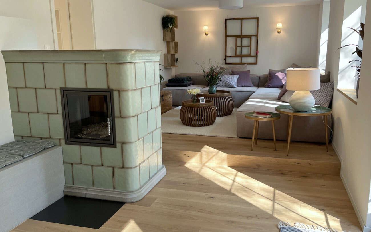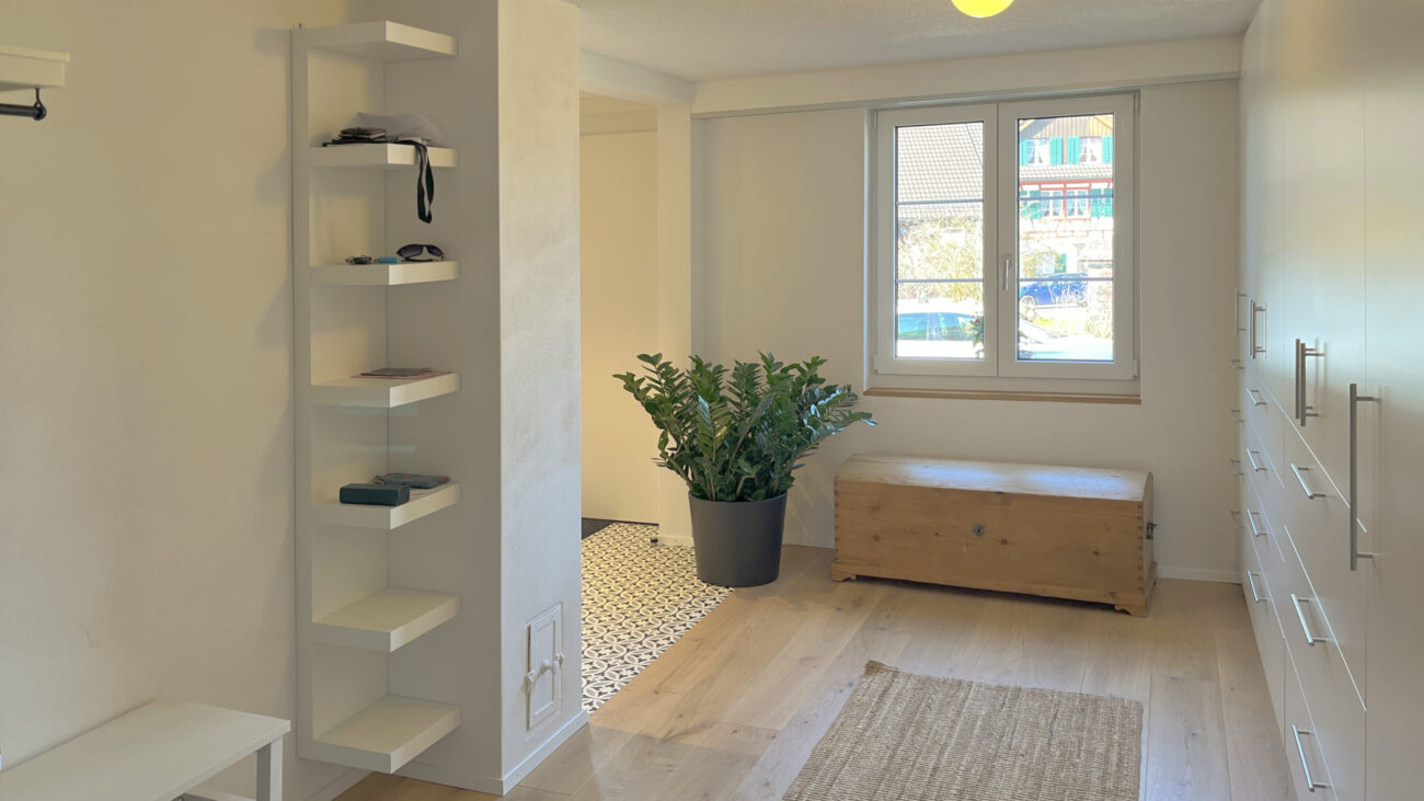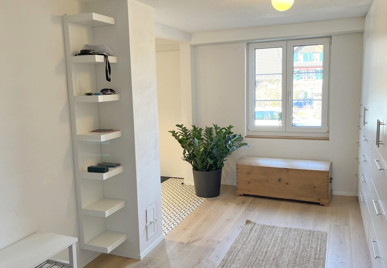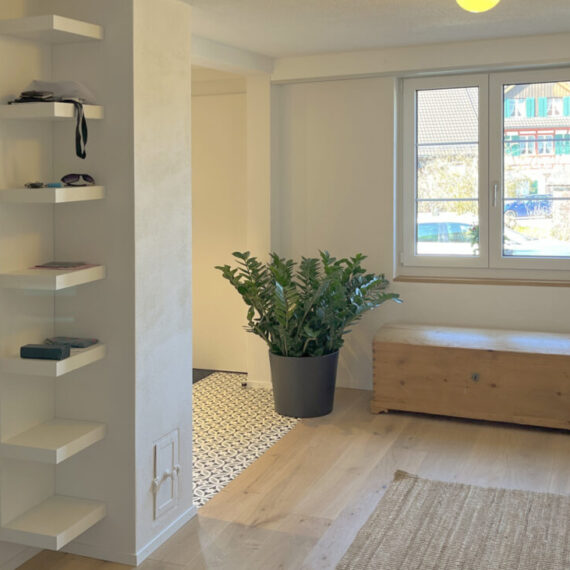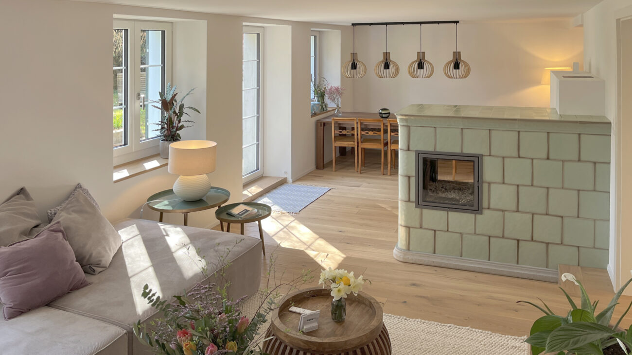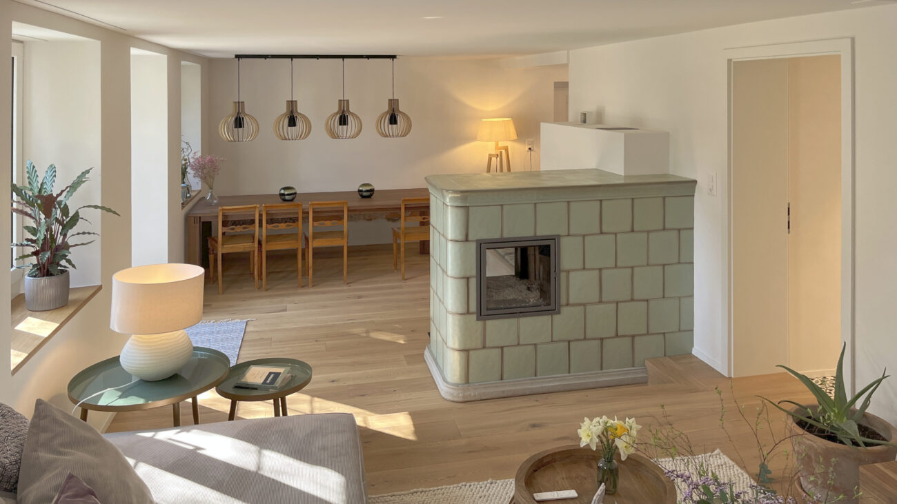 Der Umbau des Erdgeschosses hat der Wohnung neues Leben eingehaucht. Durch eine durchdachte Neuaufteilung der Räume entstand ein offenes, harmonisches Wohngefühl. Eine neue, speziell für den Raum konzipierte Küche fügt sich nahtlos in das Gesamtbild ein, während das WC an einen optimaleren Standort verlegt wurde. Ein besonderes Highlight bildet der Ofen: Der alte wurde sorgfältig rückgebaut, und der neue entstand teilweise aus dessen originalen Kacheln – eine gelungene Verbindung von Tradition und Moderne. Ergänzt wird das Projekt durch gedämmte Aussenwände sowie neue Böden im gesamten Geschoss. Das Ergebnis überzeugt mit Wohnkomfort, Charakter und einer rundum gelungenen Atmosphäre.