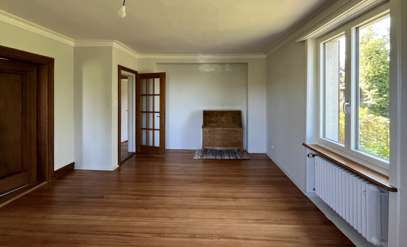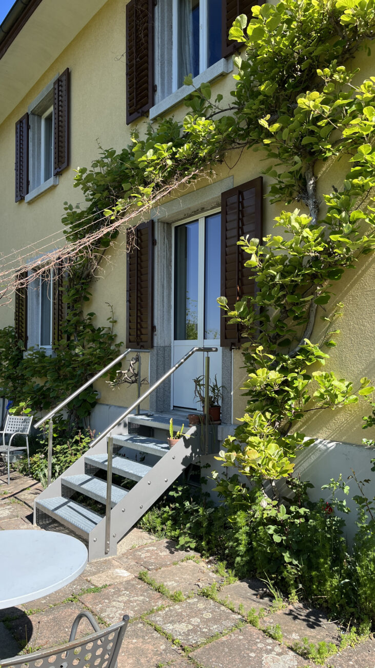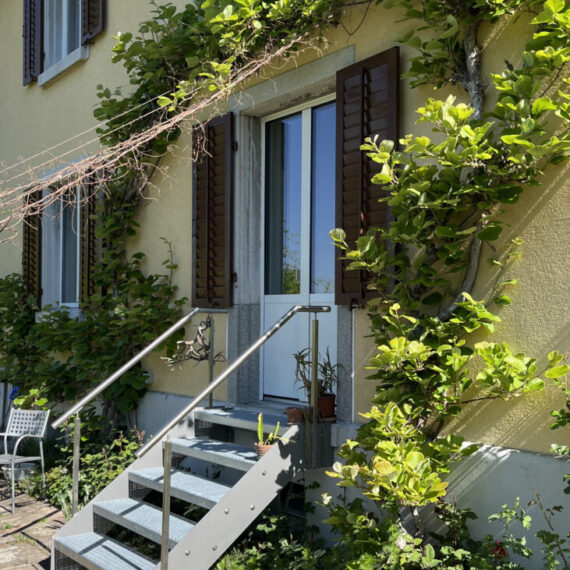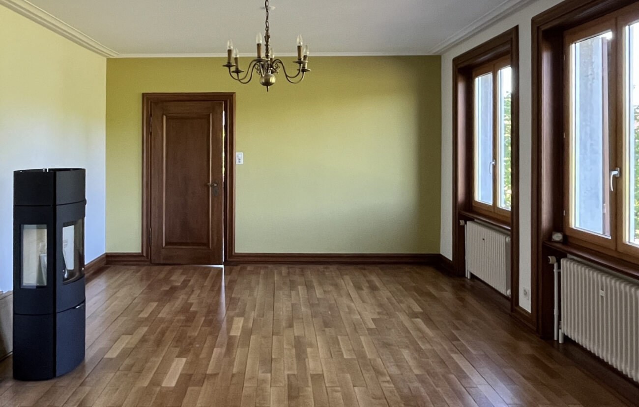 In einem der Zimmer wurde ein Fenster durch eine großzügige Balkontür ersetzt, die direkten Zugang zur neu errichteten Außentreppe und dem Garten ermöglicht. Im Wohnzimmer sorgt ein neu installierter Ofen für gemütliche Stunden und unterstreicht den wohnlichen Charakter des sanierten Altbaus.
