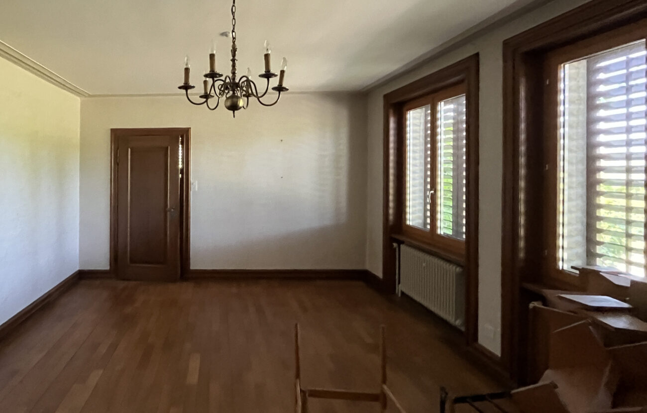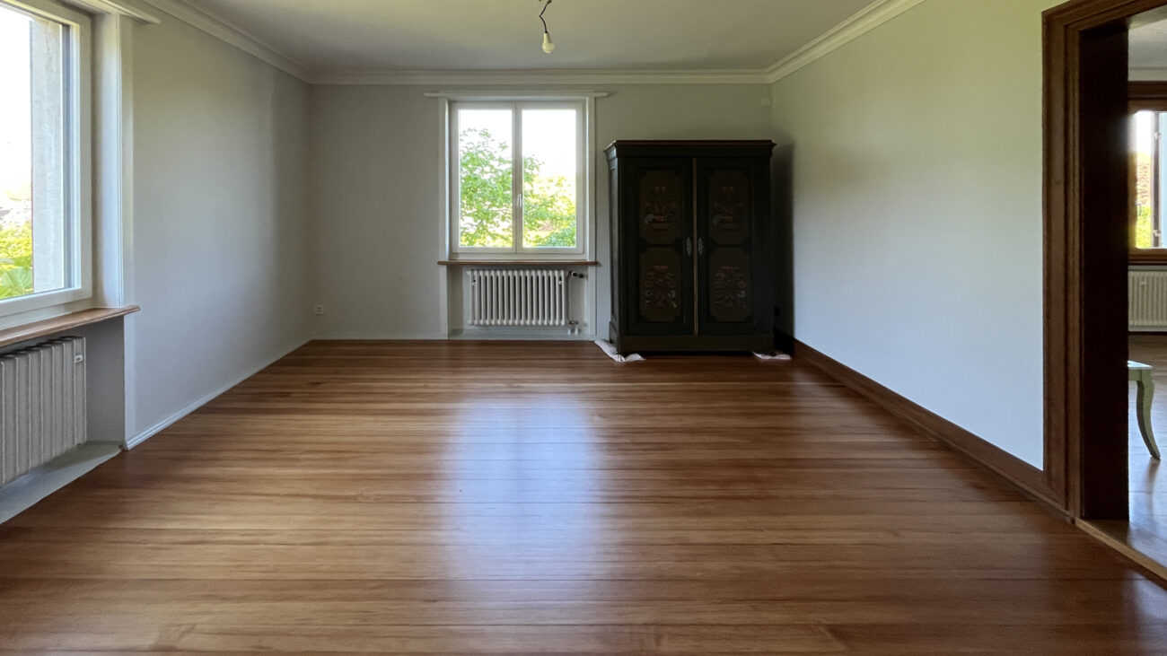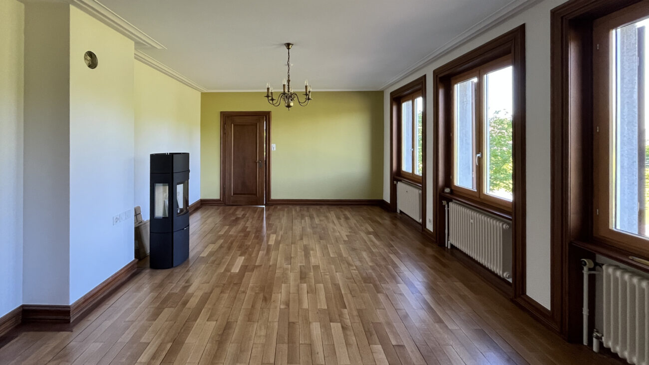 In einem der Zimmer wurde ein Fenster durch eine großzügige Balkontür ersetzt, die direkten Zugang zur neu errichteten Außentreppe und dem Garten ermöglicht. Im Wohnzimmer sorgt ein neu installierter Ofen für gemütliche Stunden und unterstreicht den wohnlichen Charakter des sanierten Altbaus.
